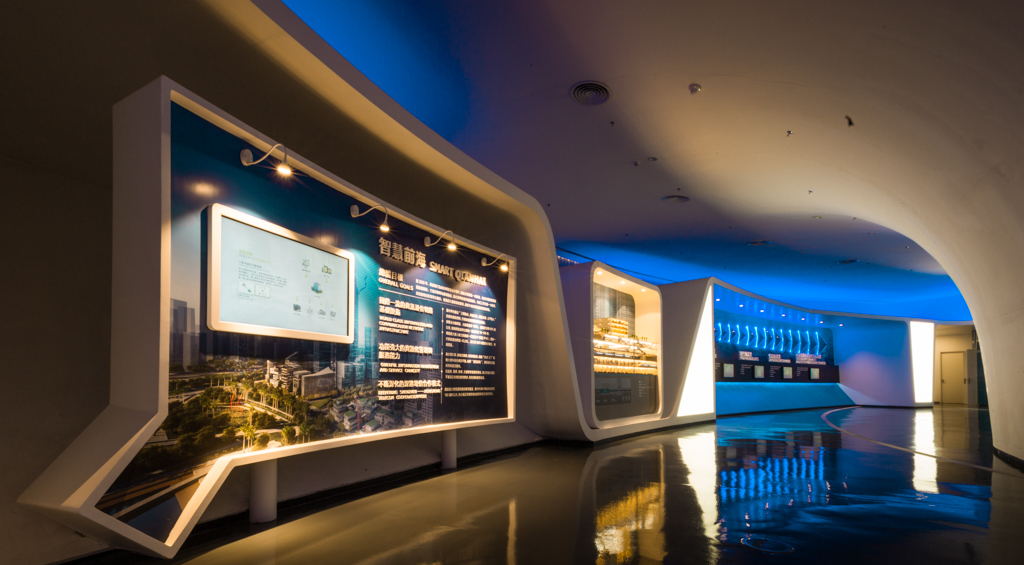 前海展示廳通過極具張力內部空間將建筑的設計語言向外迸發,對規整的建筑輪廓用開放與擴張的設計手法來體現前海的突破。建筑設計理念契合前海的氣質,寓意前海從內向外的體制改革,展示廳的每一分細節都體現著科技與未來的美感。
