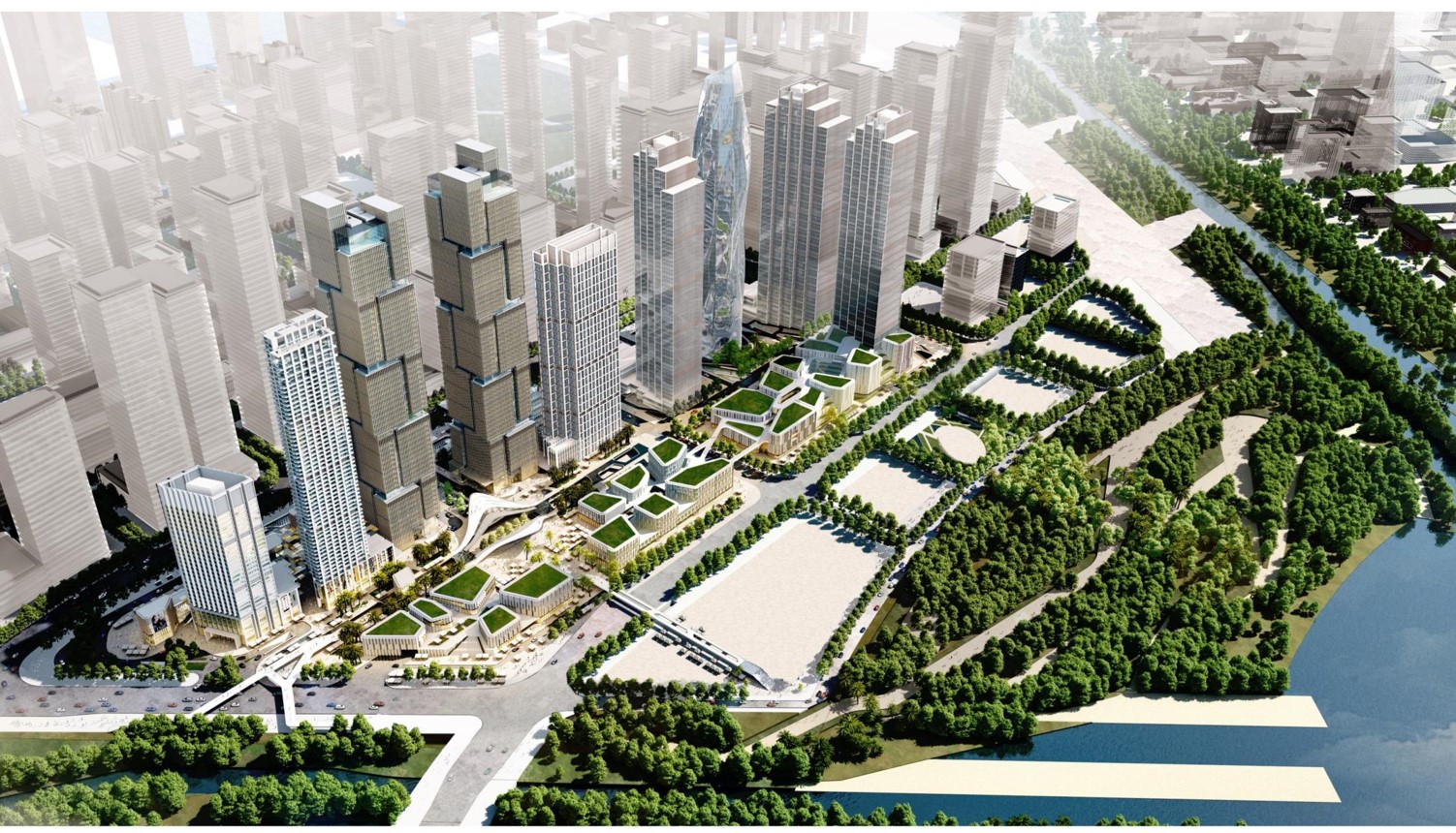 整個園區以縱橫兩條綠軸作為建筑群的幾何主軸,疊加三條南北貫穿的斜線,勾勒出整個“夢幻小鎮”的自由與開放的城市肌理。在前海企業公館建筑群中,所有的街道都是公共開敞的,行人可以隨意穿行,將街巷、院落歸還于公眾。整個園區與前海深港合作區自由的氣質相輔相成,相得益彰,為深圳發展倍添活力。